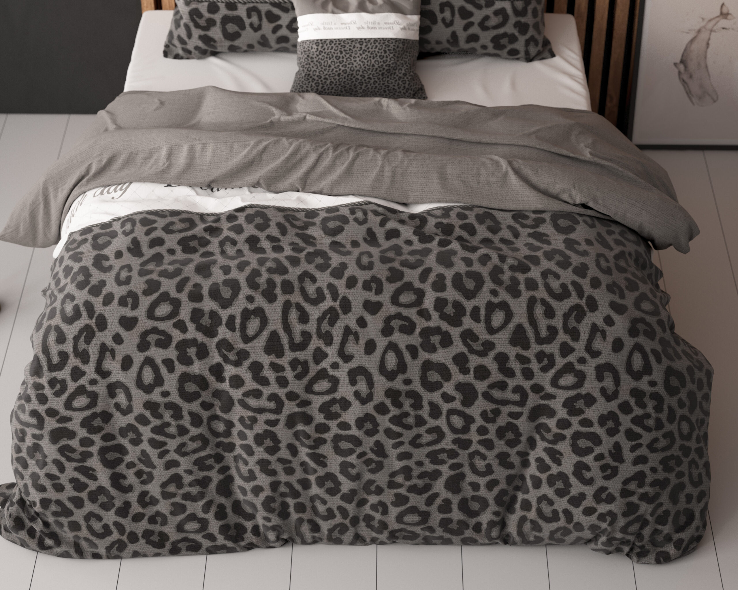 Kruip elke avond weer heerlijk weg onder dit trendy en comfortabele Sleeptime Elegance Dream and Sleep-dekbedovertrek. Dit overtrek heeft aan een zijde een stoere gewaagde panterprint en een effen dessin aan de andere zijde. Daarnaast staan ook woorden zoals ‘Dream, sleep’ en zo erop afgebeeld. Het dessin vind je terug in de kussenslopen. Combineer de dierenprint met een effen hoeslaken in de kleur wit, grijs of zwart om het plaatje compleet te maken! Dit dekbedovertrek heeft een totale lengte van 220 cm en sluit met de handige drukknopen het dekbed af.